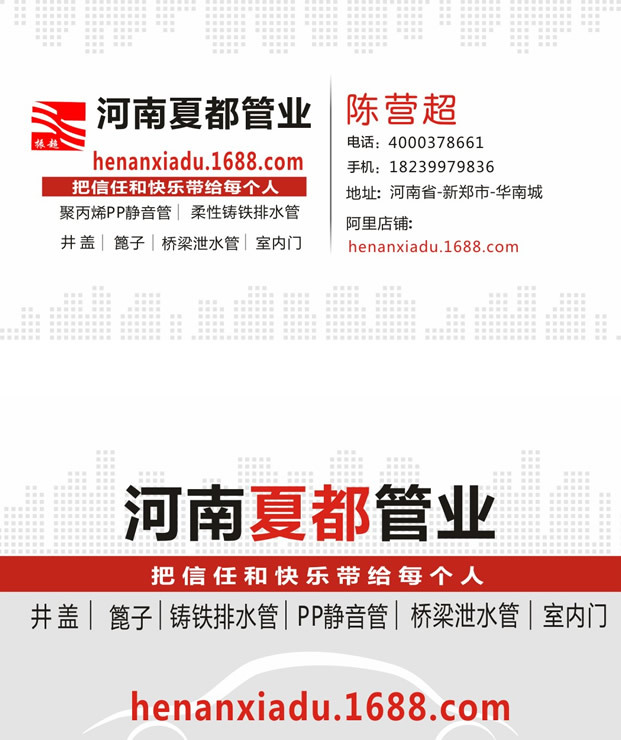 禹州市夏都柔性铸管有限公司是集生产,科研,直销为一体的高新技术企业,引进世界品牌的生产技术,生产线及检测设备,主要生产离心柔性铸铁排水管及管件,3SPP(高温聚丙烯)超静音排水管,HDPE双壁波纹排污管,PVC排水管,穿线管及配件。公司多年来一直坚持“团结、拼博、高效、安全、创新企业大品牌效益,开拓、创新、诚信、进取、铸造中国一线品牌品牌”的生产销售理念,现引进中国新型建材,促进工业的健康发展,为社会提供绿色建材产品。