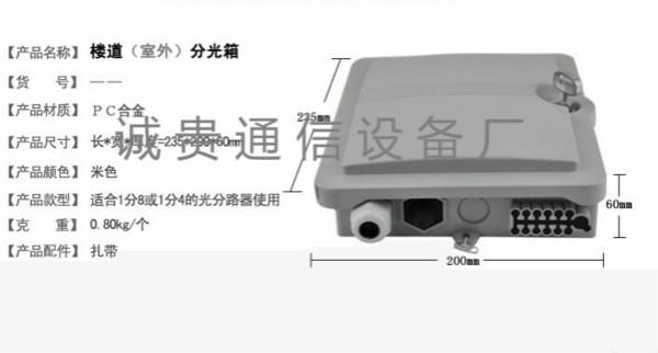 插片式光分路器箱,采用模块化设计,具有二个到四(八)个扩展槽位,将光分插片插入插槽即可。通过灵活的增加光分插片数量来实现端口的扩容,不同容量的光分模块具有通用性和互换性。另配置熔纤盘用于上联光缆的接续。尾纤的存储采用用适配器固定,实现了无跳接。箱体材料采用**冷轧钢或不锈钢。产品主要适用在FTTH接入方式下的楼道分光点。适用于FTTH的一级或二级分光,二级分光优势特别明显。
