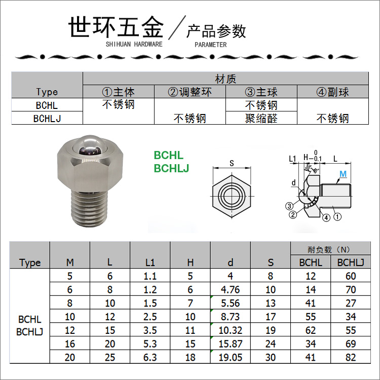 厂家批发 钢珠滚轮万向滚珠牛眼轮平台轴承六角螺母米思米标准件BCHL M5 M6 M8 M10 M12 M16 M20
