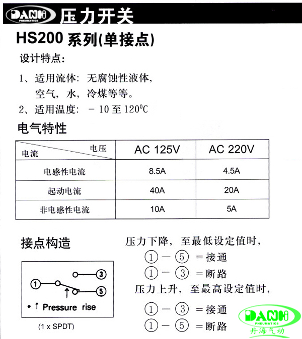 韩国进口DANHI气动元件 压力开关HS203-02 轮船气泵水泵压力控制器
