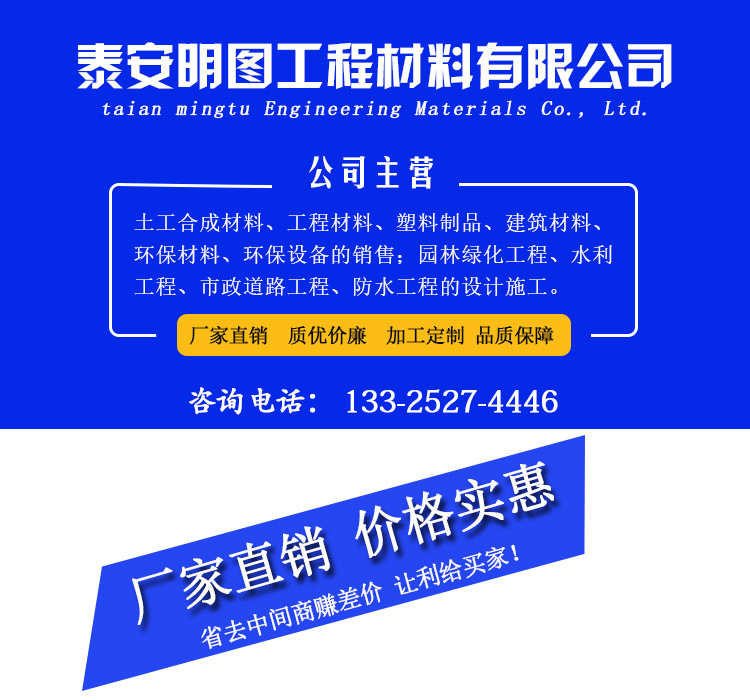 | 泰安明图工程材料有限公司注册地址位于山东省泰安高新区凤凰市场北楼三楼西,注册机关为泰安高新技术产业开发区市场监督管理局,法人代表为苏衍明,经营范围包括土工合成材料、工程材料、塑料制品、建筑材料、环保材料、环保设备的销售;园林绿化工程、水利工程、市政道路工程、防水工程的设计施工。 |