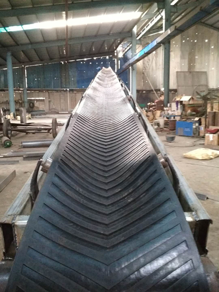 大倾角皮带输送机挡边带由基带、挡边和隔板组成,基带外观同普通输送带,但横向刚度更大:挡边为波浪状,隔板按其不同的断面可分为T型、C型和TC型。T型适用于倾角β≤40°场合,C型适用于倾角β>40°且物料流动性较好的场合,TC型适用于倾角β>40°,物料粘性较大的场合。