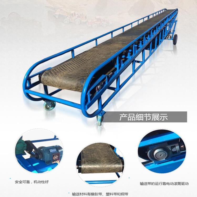 输送带的运行靠电动滚筒驱动,整机的升降与运行均为非机动.移动式胶带输送机适用于散状物料或成件物品的短途运输和装卸工作(装车专用输送机).采用钢管结构,轻巧美观,机动性好.转动装置为电动滚筒,并配有充气轮胎和钢轮两种行走轮.机长10米以上倾角可调。