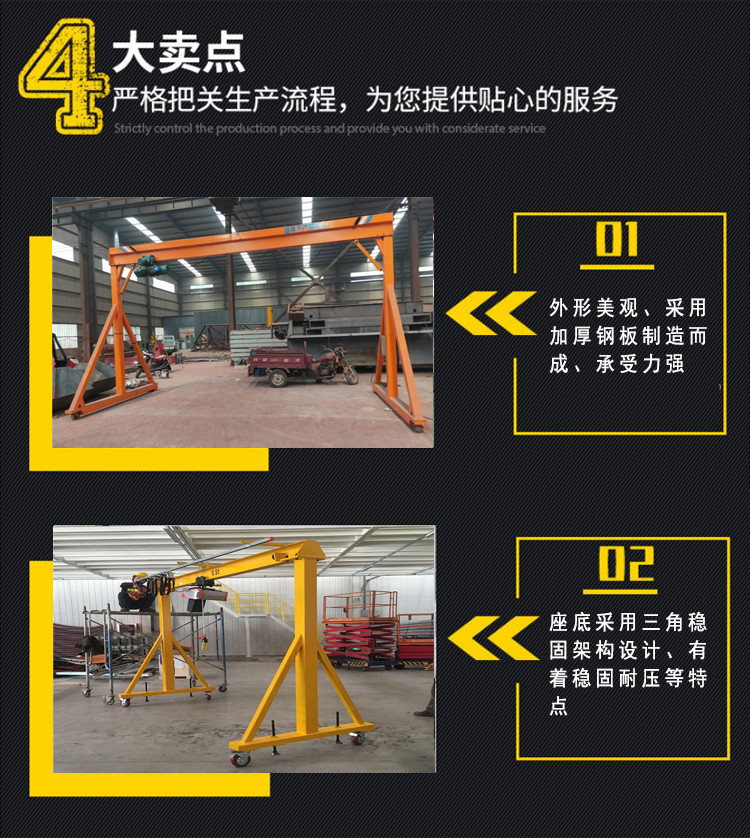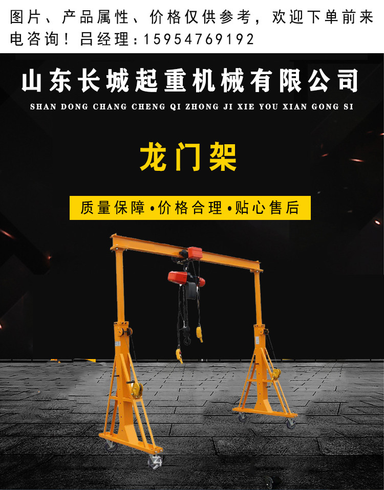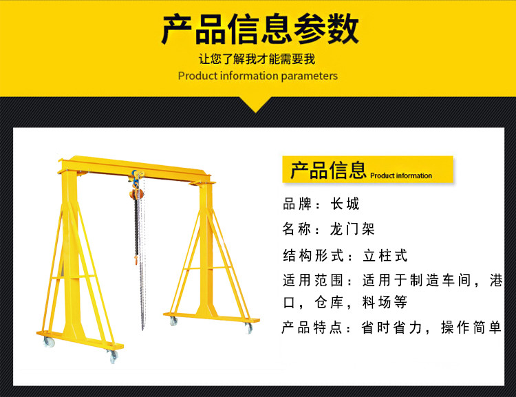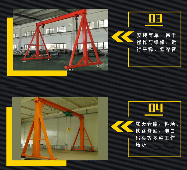 | 龙门架,主要用于室外的货场、料场货、散货的装卸作业。门式起重机具有场地利用率高、作业范围大、适应面广、通用性强等特点,在港口货场得到广泛使用。它的金属结构像门形框架,承载主梁下安装两条支脚,可以直接在地面的轨道上行走,主梁两端可以具有外伸悬臂梁。龙门架是桥架通过两侧支腿支撑在地面轨道上的桥架型起重机。在结构上由门架、大车运行机构、起重小车和电气部分等组成。有的门式起重机只在一侧有支腿,另一侧支撑在厂房或栈桥上运行,称作半门式起重机。门式起重机的门架上部桥架(含主梁和端梁)、支腿、下横梁等部分构成。为了扩大起重机作业范围,主梁可以向一侧或两侧伸出支腿以外,形成悬臂。也可采用带臂架的起重小车,通过臂架的俯仰和旋转扩大起重机作业范围。 |