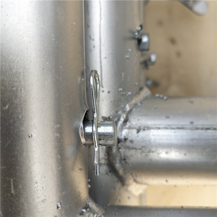 移动脚手架主要有主框,横框,交叉斜撑,脚手板,可调底座等组成。交叉拉杆又称斜拉杆、移动脚手架是纵向连接两副门架的交叉型拉杆。杆件两端压扁部分冲有销孔,组装时与门架立杆上的锁销锁牢。
