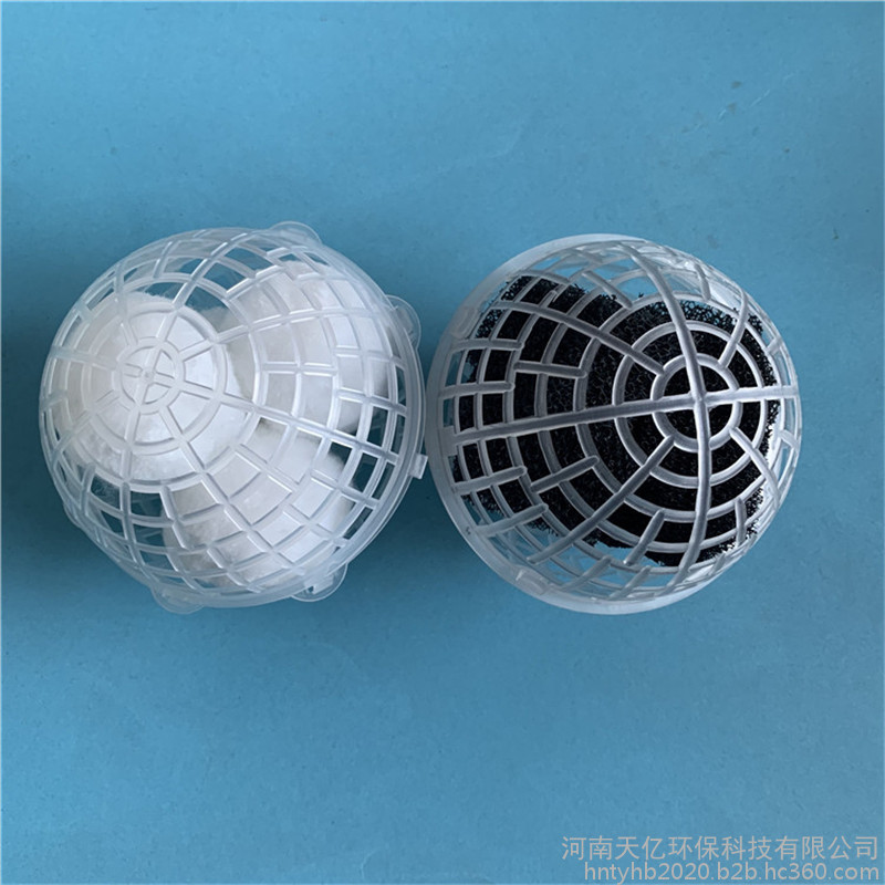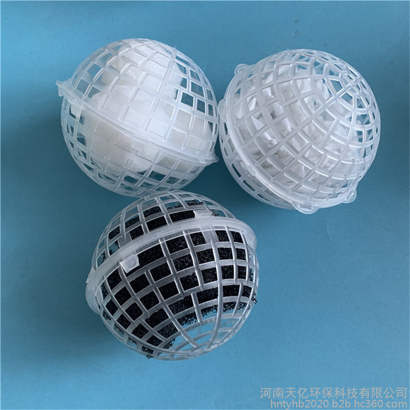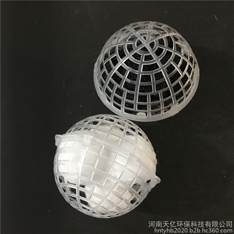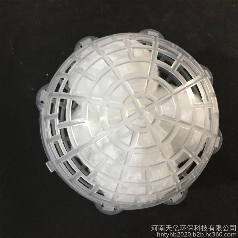 多孔悬浮球型填料是在众多污水处理填料的基础上开发的新材料。主要起生物膜载体的作用,同时兼有截留悬浮物的作用,具有生物附着力强、比表面积大、孔隙率高、化学和生物稳定性能好、经久耐用,不溶出有害物、不引起二次污染、亲水性能强等优点,是任何软性、半软性、组合、弹性填料无法实现的。