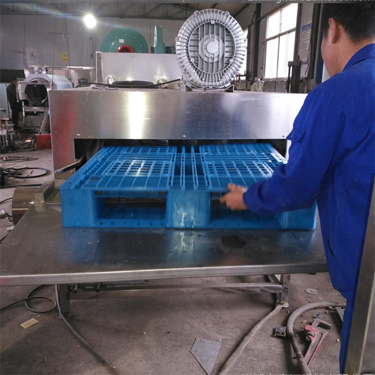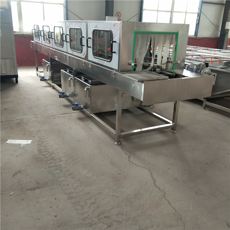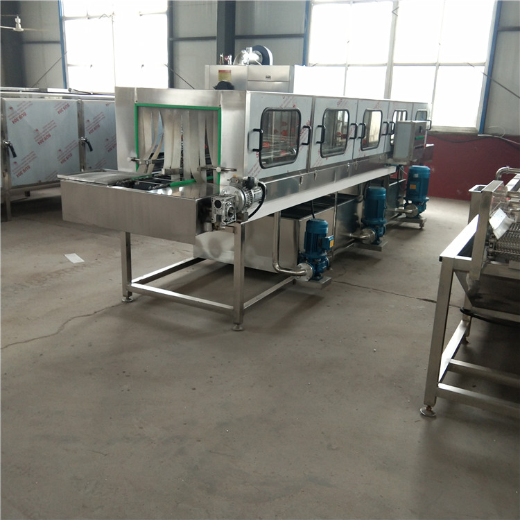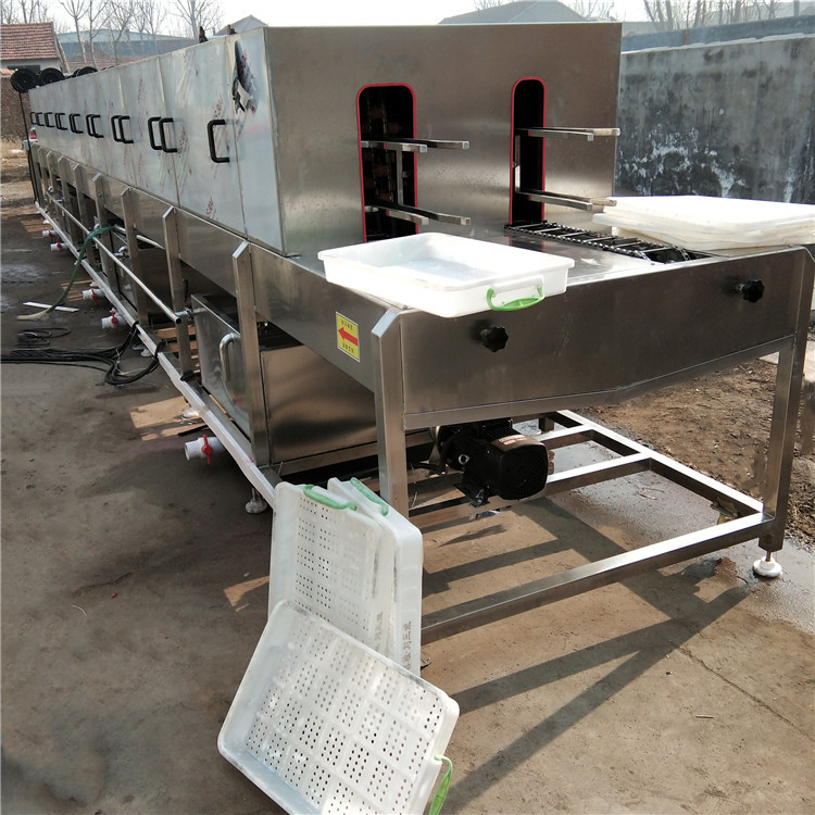 本机是我公司自主的新型全自动洗筐机,周转筐通过输送带送至高压喷淋清洗仓内,进行往复式喷淋清洗,使周转筐达到很的清洗效果,本机采用SUS不锈钢制造,将洗涤段和清洗段分段设计,同步运行减少人力成本,降低劳动强度,是食品企业规模化生产的设备。