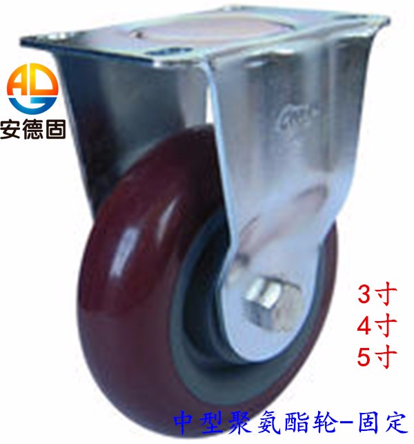 轮面由聚氨酯注塑而成,外型美观大方,抗磨,减震,弧形轮面,滑行阻力小,行走轻便。 轮体外包颜色通常为枣红色,可根据需要定制调色。 使用推介:机械设备、轻型推车、仓储物流车等。 安德固脚轮 中型聚氨酯双轴万向轮 定向轮中型聚氨酯轮系列-定向轮。有3寸,4寸,5寸三种规格,内嵌两个全新轴承,转动更加灵活,轮子更加持久耐用。**万向轮,以质量求发展。给您**高的性价比。