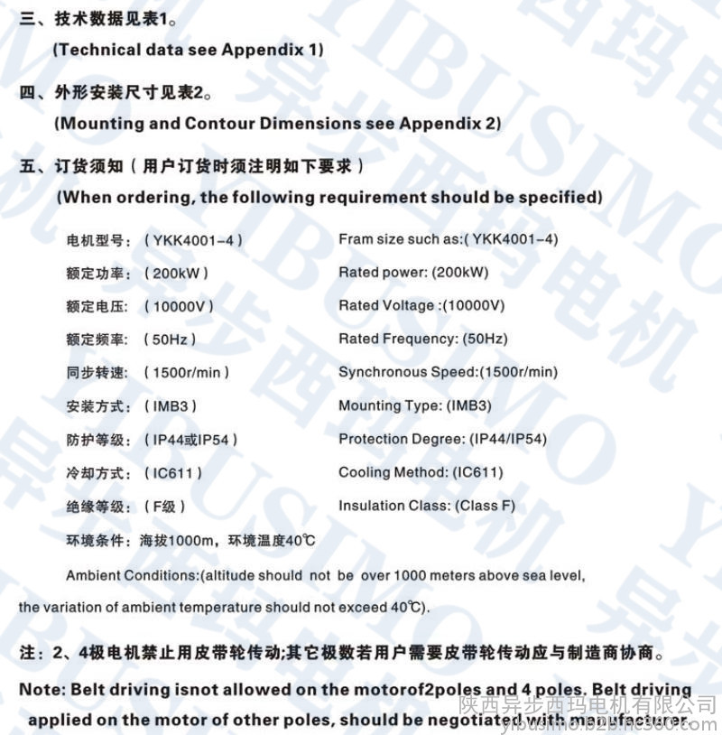 Y系列中型鼠笼式转子高压三相异步电动机,电动机采用箱式结构,电动机顶部可以安装防护罩,防护等级IP23,冷却方式IC01,安装型式IMB3,电源频率50Hz,电源电压为10000V,允许电压的偏差范围为±5%,电源的额定频率为50Hz。中心高400mm~630mm,功率范围185kW~10000kW;