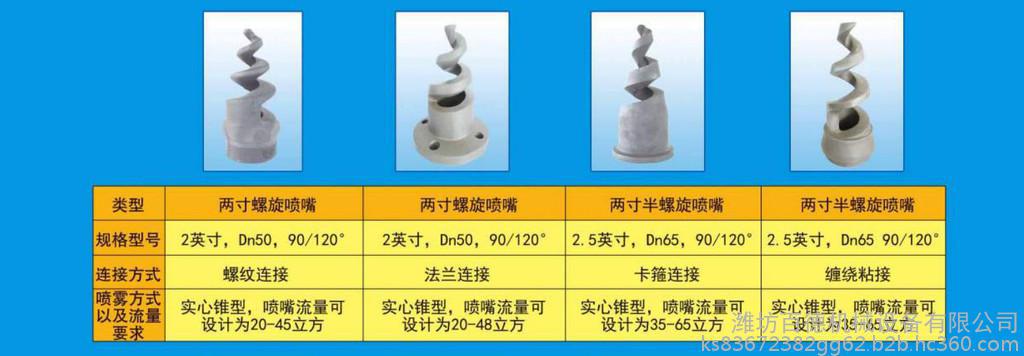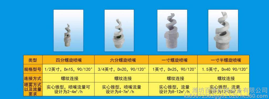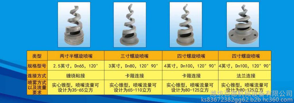 螺旋喷嘴连接尺寸从1/2英寸到4英寸,连接方式为缠绕粘结,螺纹连接,法兰连接和卡箍连接。喷雾形状为实心圆锥状,喷射区域呈环形,喷射角度90°或120°(可定做)。
