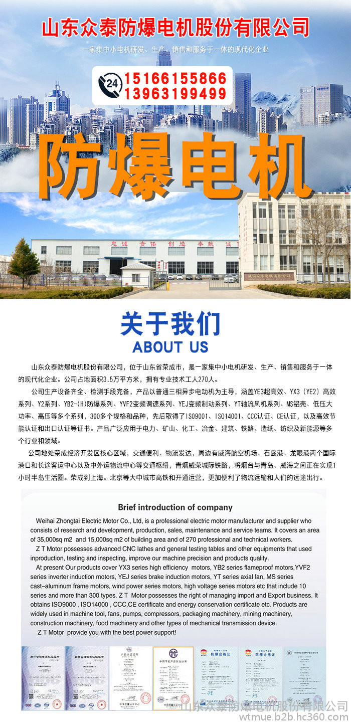 山东众泰防爆电机股份有限公司,位于山东省荣成市,是一家集中小电机研发、生产、销售和服务于一体的现代化企业。公司占地面3.5万平方米,拥有专业技术工人270人。公司生产设备齐全、检测手段完备,产品以普遍三相异步电动机为主导,涵盖YE3超高效、YX3(YE2)高效系列、Y2系列、YB2-(H)防爆系列、YVP变频调速系列、YEJ变频制动系列、YT轴流风机系列、MS铝壳系列、风电系列、高压系列等到十个系列,300多个规格和品种,先后取得了ISO9001、ISO14001、CCC认证,以及节能认证和出口认证等证书。产品可广泛用于电力、矿山、化工、冶金、建筑、铁路、造纸、纺织及新能源等多个行业和领域。公司恪守“诚信为本、质量兴业”的理念,始终坚持“科技创新,为客户创造价值”的宗旨,把产品做精,把企业做强。未来产品将按照“特、精、尖”的目标,向高压防爆、调速步进及电力新能源等高端、高效、高附加值电机拓展;市场将按照“立足山东、巩固华北、拓展东北、辐射全国”的思路,销售和服务网延伸到全国各地,出口涵盖到东南亚、中东、南非和欧美地区。---- 山东众泰电机愿与各界朋友精诚合作、共谋发展!
