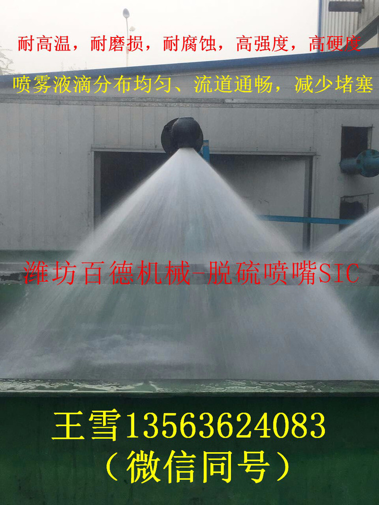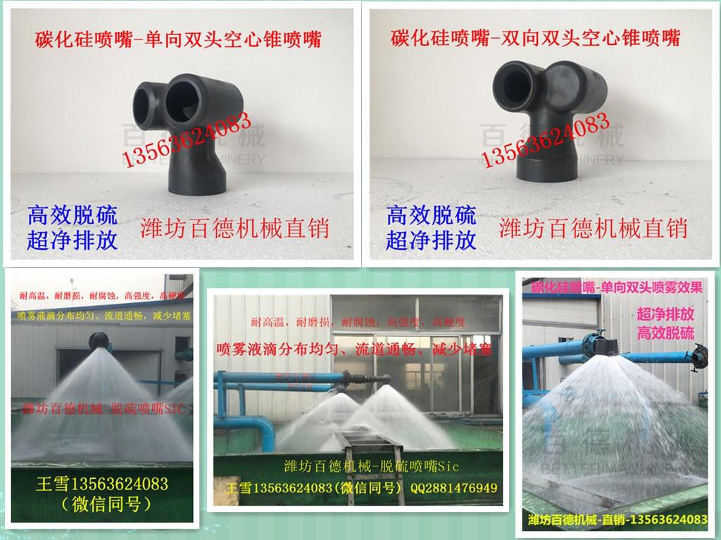 碳化硅脱硫喷嘴是火力发电厂、大型锅炉,脱硫除尘成套装置的关键部件。该产品具有高强度、高硬度、抗强烈腐蚀、剧烈磨损、耐高温等优良的性能,在恶劣的条件下有超长的使用寿命。 我公司生产的反应烧结碳化硅脱硫雾化喷嘴,喷雾液滴分布均匀、流道通畅,无阻塞现象,完全代替进口产品,填补了国内空白。目前有螺旋型、旋流型、液柱型三大系列几十多个品种,已应用于多家火电厂和大型锅炉的脱硫除尘装置中,运行状态良好