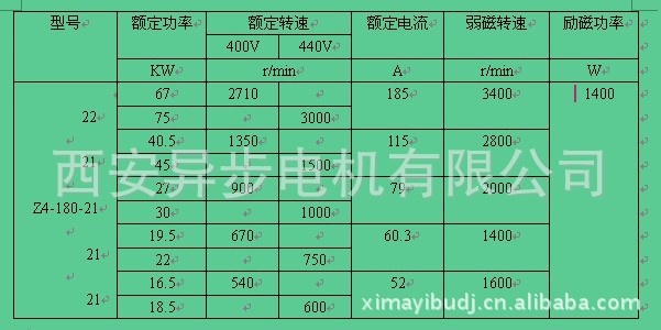 Z4系列直流电机的功率范围由1.5kW至840kW,额定转速有3000、1500、1000、750、600、500、400、300、200r/min共九种,励磁方式为他励,励磁电压为180V,除上述规定的等级外,根据具体情况和用户的需要,可派生出其他的功率、电枢电压、转速及励磁电压值。