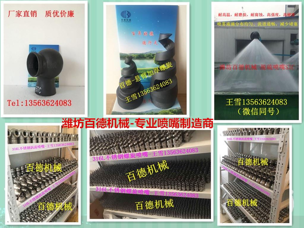 连接方式有卡箍连接,法兰连接,螺纹连接和缠绕连接等碳化硅大流量喷嘴又称为真空反应烧结碳化硅脱硫喷嘴,是火力发电厂、大型锅炉,脱硫除尘成套装置的关键部件。国内生产的反应烧结碳化硅脱硫除尘喷嘴,逐渐代替进口产品,同时具有高强度、高硬度、抗强烈腐蚀、剧烈磨损、耐高温等优良的性能,在恶劣的条件下有超长的使用寿命