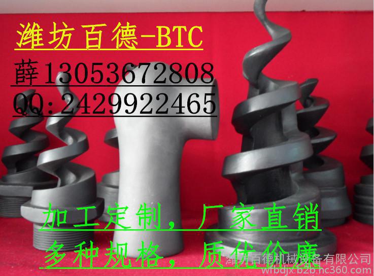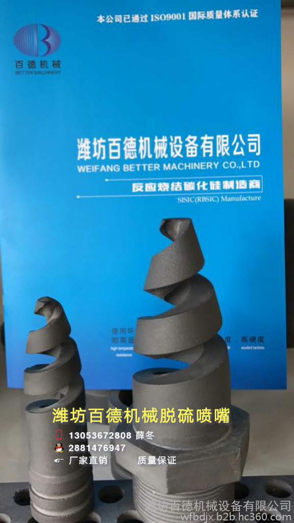碳化硅螺旋喷嘴工作原理,螺旋喷嘴是众多喷嘴中**有特色的一种。随着连续变小的螺旋体,浆液不断经螺旋线相切和碰撞后改变方向成片状喷射成同心轴状锥体,不同层椎体喷射面流线与喷嘴轴心的夹角逐层减小,而且液体在从进入喷嘴腔体到出口的通道内均没有受到任何阻碍。且在很低的操作压力下仍具有很高的吸收效率,获得了脱硫系统的普遍认可。