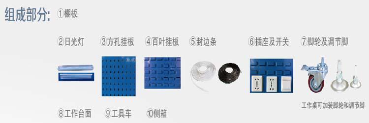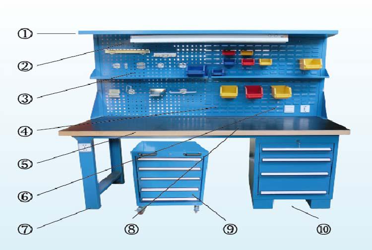 l 可加装百页挂板 方孔挂板,方便放置各类手动或电动工具和零件盒,也可以根据不同需要加装电源插座、脚轮、调节螺丝、照明灯置物搁板,也可按要求定制特殊规格及样式的工作桌。