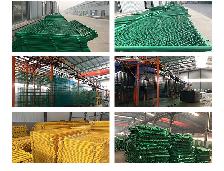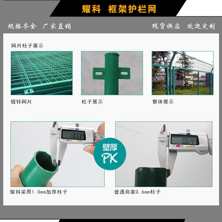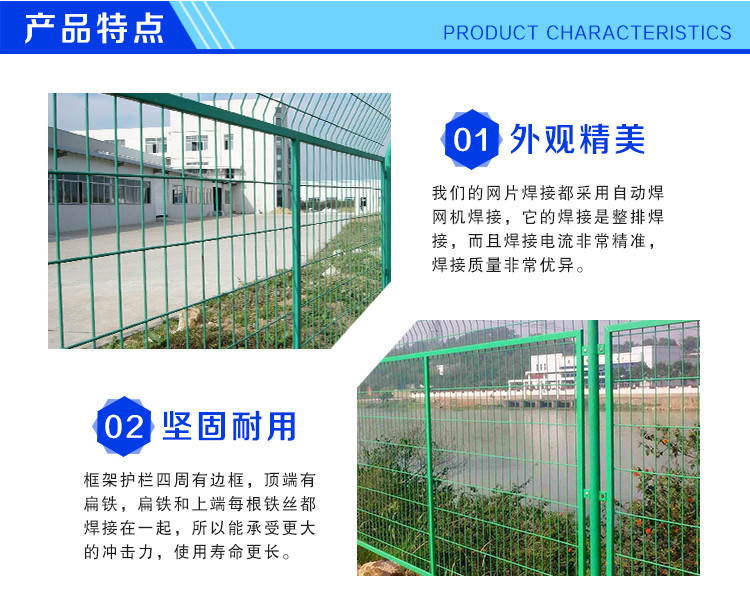框架护栏网采用**盘条作为原材料,经由镀锌、涂前底漆和高附着力粉末喷涂三层保护的焊接式网片,具有日久抗腐蚀、抗紫外线的特性。在这种护栏网的表面处理为镀锌和喷涂,也可以任选一种,顶端盖有塑料盖或防雨帽。根据环境和安装方式不同,可选用预埋50cm、加底座等方式。将框架护栏网的网片和立柱靠螺丝和各类特殊的塑料或铁的卡子连接。所有的螺丝均为自动防盗的。所用配件也可以按照客户的具体要求来设计。