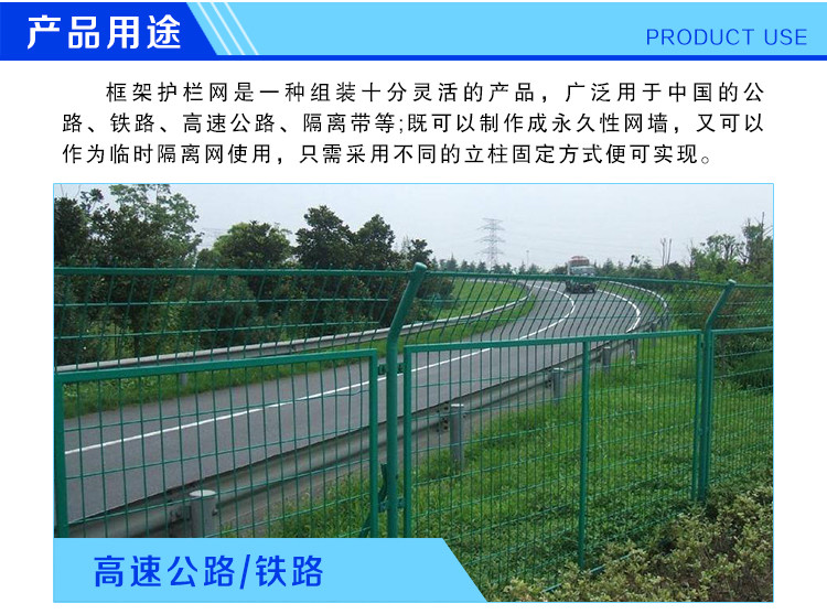 框架护栏网又称为"边框式防攀焊接片网",“框架隔离栅”等。它是一种组装十分灵活的产品,广泛用于中国的公路、铁路、高速公路等;既可以制作成网墙,又可以作为临时隔离网使用,只需采用不同的立柱固定方式便可实现。