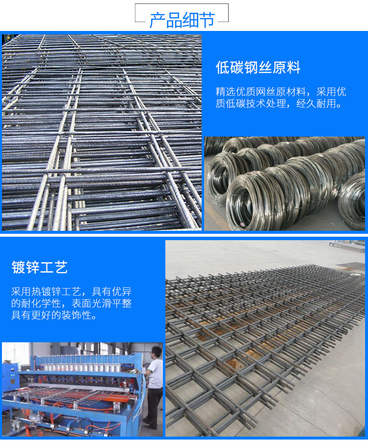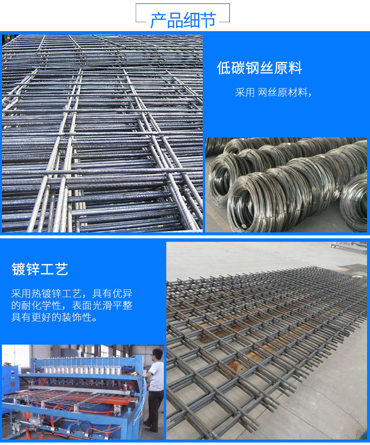钢筋网片还是一种采用Q195低碳钢铁丝排焊而成,然后再冷镀(电镀)、热镀、PVC包塑等表面钝化、塑化处理、网面平整、网目均匀、焊点牢固、局部机加工性能良好、稳定、防腐、防蚀性好网格状丝网产品。钢筋网片分为:电镀锌钢筋网片,热镀锌钢筋网片,浸塑钢筋网片,三角折弯钢筋网片等。在钢筋网片成型后进行镀锌(电镀或热镀);产品系选用镀锌铁丝通过精密的自动化机械焊接制成。具有焊点牢固,结构合理,网孔均匀等特点,网面平整、结构坚固、整体性强