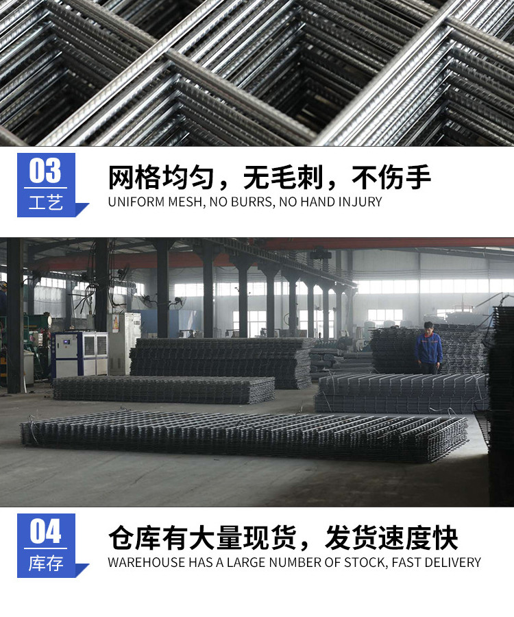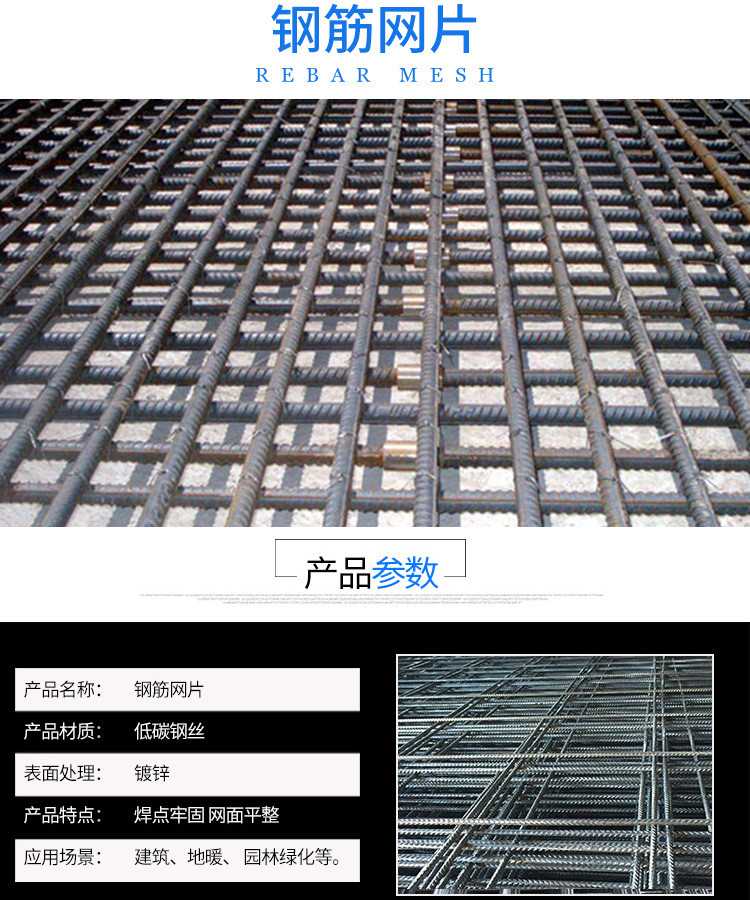 钢筋网片是一种焊接成型的网状钢筋制品采用低碳钢丝、不锈钢丝用冷轧带肋钢筋或冷轧圆钢筋以纵向和横向成直角,且按一定间距将所有交叉电焊接而成,全部交叉点均用强电阻压力熔焊在一起。具有产品精度高、误差小、质量好等特点。