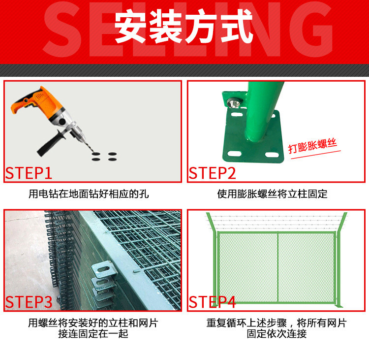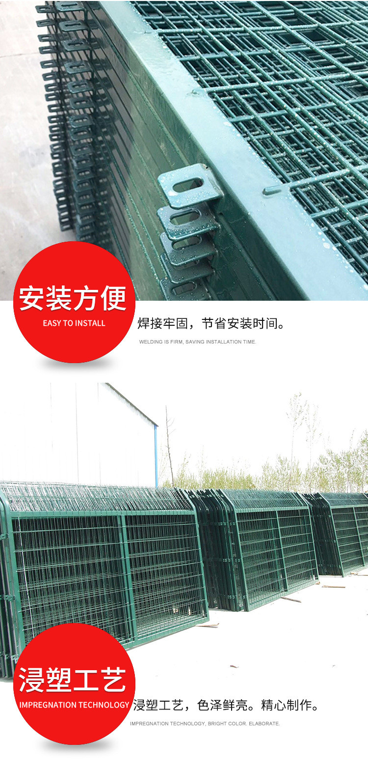 结构:立柱分为镀锌钢管、桃型柱、燕尾柱以及C型钢等,网片分为包塑钢丝网、PVC包塑电焊网、勾花网以及钢板网和冲孔网。其大致结构为立柱和边框通过连接件连接,也可以用网片直接与立柱卡接、螺栓连接和连接件铆接,角度可任意。