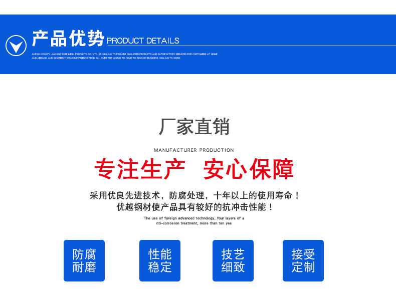 特点:焊接牢固,网孔均匀,网面平整,耐腐蚀、强度大、防护能力强。