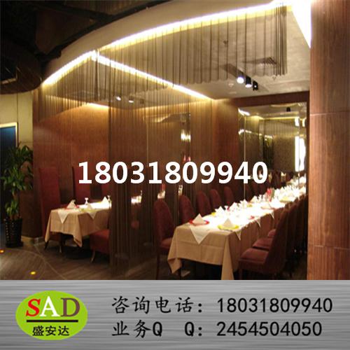 室内装饰帘由铝镁合金丝,碳钢丝,铜丝,不锈钢丝等螺旋编织而成,常用规格有丝径1mm孔径5mm,丝径1mm孔径8mm,丝径1.2mm孔径8mm;金属网帘表面可以是金属本来的颜色,也可以处理成古铜,金色等其他金属色。具有尺寸任意,颜色任意、易于安装、功能性强、装饰效果生动、适合大小面积使用等特点,是一种新型建筑装潢及**室内装修的理想材料,被广泛用于建筑物的立面、室内的隔断、屏风、吊顶、墙面、窗帘、阳台和走廊等。现以在机场、酒店、展厅、歌剧院、写字楼、商场、酒吧、私人住宅等的**内外装修中使用,是国内设计师的新宠。