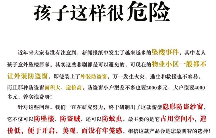 大量供应各种规格隐形防盗网、防盗纱窗、免焊接防盗窗系列材料、成品、配件等全套产品。多年来一直从事专业生产、设计、销售,在新产品的研发、产品创新、品质和售后服务等方面,位居国内同行业首位;已树立一个业界技术**.守诚信**的安全专家形象,为客户提供整套安全、防盗、防蚊系列产品,并多次获得国内本行业品牌等企业荣誉证书。