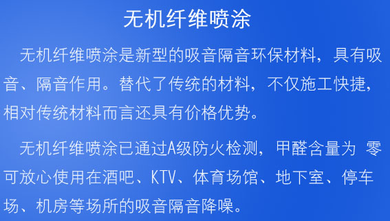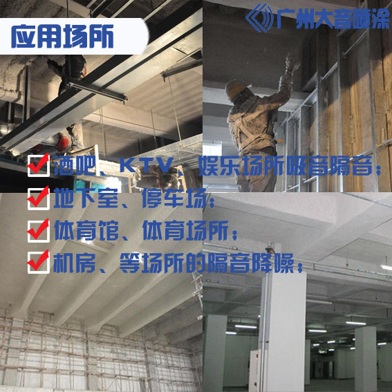 无机纤维吸音喷涂广泛应用于酒吧、KTV、体育馆、展览馆、会议中心、歌剧院、音乐厅、电影院、演讲厅、教堂、夜总会、的士高、酒廊、地铁、隧道、机场、车站、钢结构建筑、厂房(隔音保温)、公共场所等。
