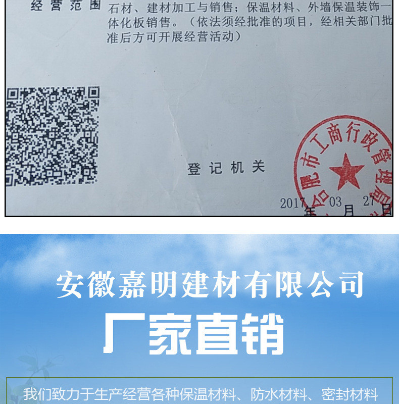 安徽嘉明建材有限公司是安徽省防水保温协会理事单位,一直以来致力于环保建材的研发生产、销售为一体的现代化建材企业,有着丰富的实践经验和深厚的理论基础,产品种类丰富有岩棉板、挤塑板、匀质板、珍珠岩棉板材与各类辅材,产品性能优异、价格实惠。公司先后承接了合肥火车站改造项目,合肥中环城办公楼、蚌埠恒大翡翠华庭、毫州恒大中国府、利丰剑桥郡、华东电子研究院等众多工程项目遍布省内外。公司本着科技为本的原则,坚持高起点。高标准的企业运作,公司秉承“志高品质,至诚服务”的宗旨,以高品质的产品和周到的服务立足于市场。在今后的发展道路上更加注重品牌管理,力争在技术再获突破,创造行业品牌,为我国的建筑节能方向做出贡献。