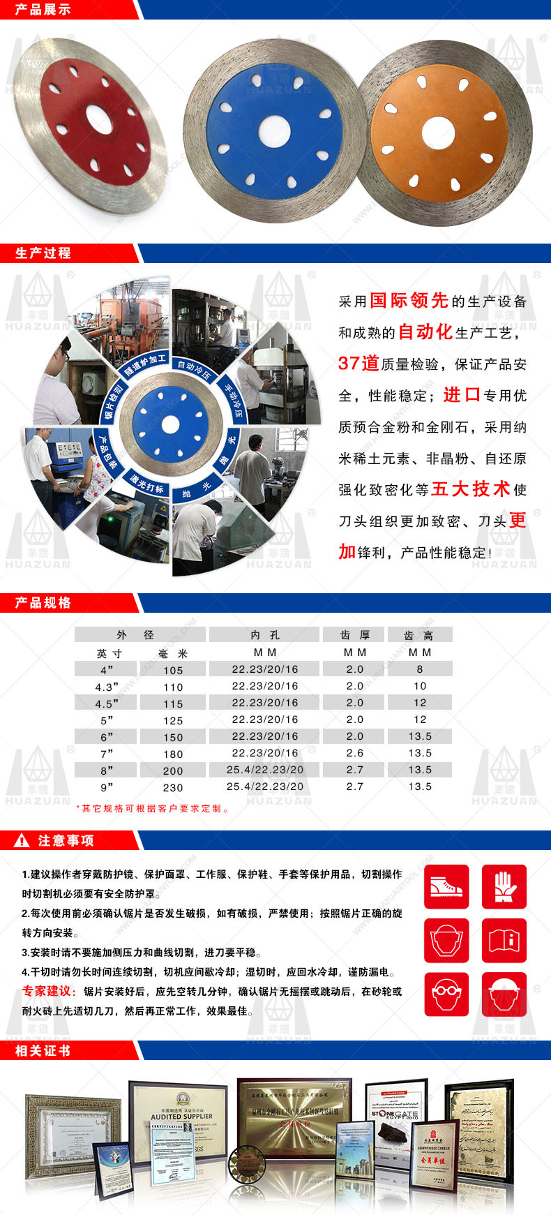 5.制品广泛应用于石材,瓷砖、混凝土,粘土砖,加气砖,水泥砖,泡沫砖等建筑材料的切割作业。用户需要根据制品的用途来购买相应的锯片以获得良好的成本效率价值。