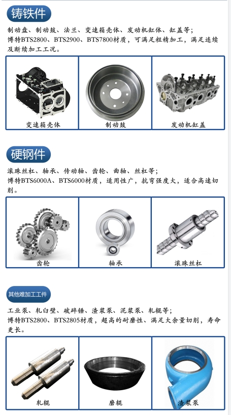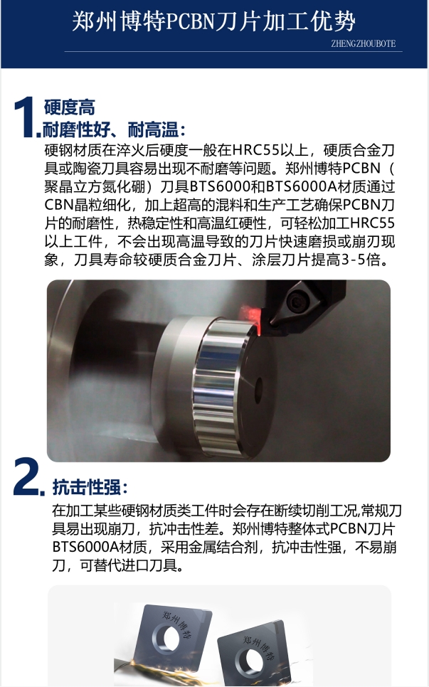 4、适合高速切削:PCBN刀具是全自动流水线大批量生产硬钢件的理想刀具,可承受高温,高速,断续等工况。郑州博特PCBN刀片BTS6000材质其线速度达2000m/min,车削硬钢件的性能较好。