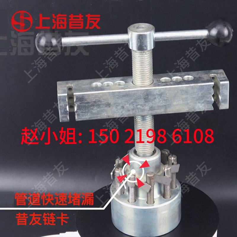 当管道或容器出现局部泄漏时,可以使用本品套扎在泄漏周围,把顶杆压在泄漏部位,然后旋拧顶杆直至不漏为止,根据链条长度来确定管道和容器直径。顶压直径大2600mm,压力9.0MPa,温度900度,介质:任意。