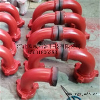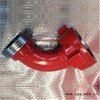高压活动弯头是一种装有滚珠轴承的金属管线接头,是油田修井作业连接管线、冲砂常用的工具,它具有调节方位多变,连接快捷、结构合理、体积小、重量轻、密封性能好,安全可靠,操作方便的特点,其规格有2"~3",额定工作压力42MPa~105MPa(2000psi~15000psi)