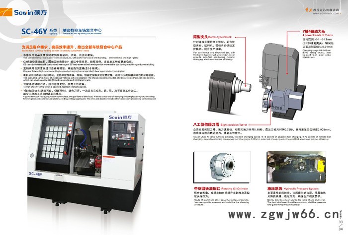 本体采用高品质铸铁30°斜床身结构,抗弯、抗扭刚度强。 C3研磨级滚珠丝杆,两端固定选用60°丝杠专用轴承,做预拉伸,定位加工精度更加稳定。 主轴采用台湾原装进口普森高精密、高速炮筒主轴(含5个轴承)。 电机采用日本安川伺服电机,全脉冲控制准确**、快速定位等实现位置控制,可用于Cs轮廓和刚性功牙等功能。 台湾兆奕伺服刀塔,换刀速度更快,提高工作效率。 Y轴4轴动力头(端面两位,侧面两位)。结合刀塔,一次装夹完成车、铣、钻、攻等复杂工件加工。减少二次加工带来的误差和损耗。