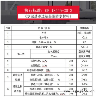水泥基渗透结晶型防水材料是一种无毒、环保、可透气、渗透活化物质的灰色粉状高科技产品。它是水泥、精细石英砂及多种活性化学成份配制而成的。与水作用后,材料中含有的活性化学物质通过载体水向混凝土内部渗透,在混凝土中形成不溶于水的结晶体,堵塞毛细孔道,从而使混凝土致密、防水。