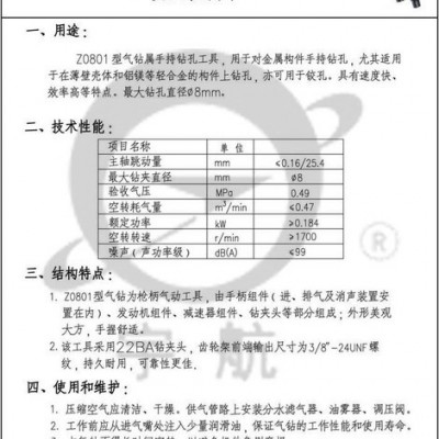 前哨生产的气宇航牌Z0801气钻,精度高,寿命长,主轴跳动量小,适于用精密孔的加工,功率达到184W,重量轻,操作舒适。