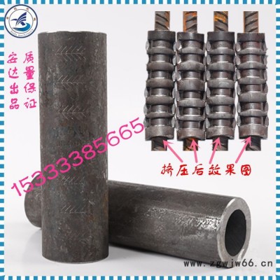 套筒挤压连接是将需要的连接的钢筋(应为带肋钢筋)端部插入特制的钢套筒内,利用挤压机压缩钢套筒,使它产生塑性变形,靠变形后的钢套筒与带肋钢筋的机械咬合紧固力来实现钢筋的连接。用这种连接方法制作的钢筋套筒就叫做钢筋冷挤压套筒。