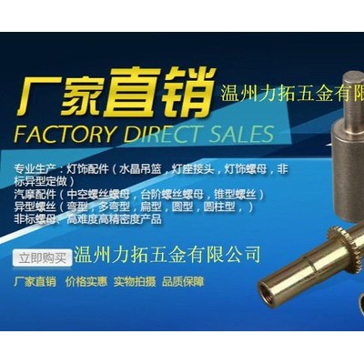 温州力拓有限公司创办于2010年,于飞速的发展速度在行业中揭起,现公司拥有厂房两个,引进具有国际先进水平的台湾多工位自动冷墩设备及仪表车床,厂房面积2000多平方,公司总经理王敏先生被业内人士称为龙湾**人!公司同时在广州和温州上江紧固件市场拥有多家店面,现应广大客户和时代要求在多个网络平台开通在线销售业务方便客户查找询问我们。欢迎新老客户来电或上门询问您的来电是我们的**大荣幸! 温州力拓有限公司专业产品有: 灯饰配件(水晶吊篮,灯座接头,灯饰螺母,非标异型定做) 汽摩配件(中空螺丝螺母,台阶螺丝螺母,锥型螺丝) 异型螺丝(弯型,多弯型,扁型,圆型,圆柱型,) 非标螺母、高难度高精密度产品 我公司拥有完整、科学的质量管理体系。温州力拓五金有限公司的诚信、实力和产品质量获得业界的认可。欢迎各界朋友莅临参观、指导和业务洽谈。 公司从创办初**致力于品牌质量经营,从“包质包量”,“精密求精”的质量和 服务理念,履行客户的成功才是我们的成功的理念服务客户,实现客户利益**,让我们携手力拓 共创美好未来! 联系电话:0577-86666879 0577-56663068 传真:0577-56663067