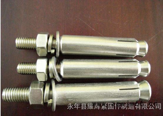 膨胀螺栓是由沉头螺栓、胀管、平垫圈、弹簧垫和六角螺母组成。 膨胀螺栓的构成的。