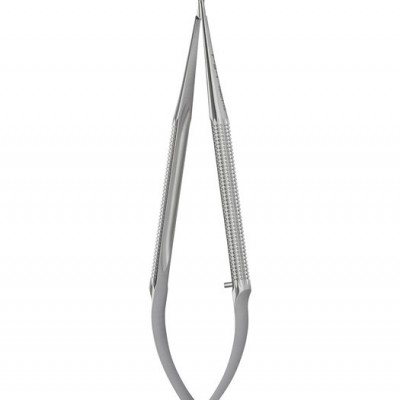 Round Handled Vannas Spring Scissors Tips: Sharp Cutting Edge: 6mm Tip Diameter: 0.1mm Length: 12.5cm Alloy / Material: Stainless Steel Serrated: No Tip Shape: