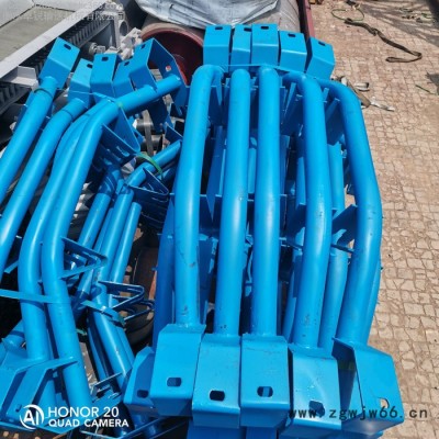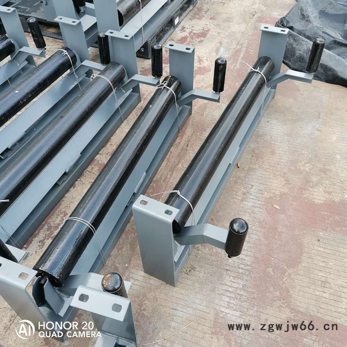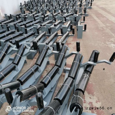 托辊支架装置既便于更换托辊的托辊支架装置,涉及有可偏转托辊支架、支座、销轴、机身、托辊、限位块和紧固件组成。支座下端与机身上端用紧固件连接在一起,支座则用销轴与可偏转托辊支架连接在一起,在可偏转托辊支架上设置有托辊。在可偏转托辊支架上,设置有供绕销轴转动的卡槽,托辊则安装在可偏转托辊支架的卡槽中,在可偏转托辊支架上设置有控制偏转角度的限位块。在支座或机身上设置有供可偏转托辊支架绕其转动的销轴,在拆下紧固件的情况下,可偏转托辊支架可以在限位块的控制下绕水平固定的销轴转动一定的角度。 槽型支架属于托辊支架的一种。采用先进的生产工艺,可靠产品。槽型托辊清除皮带沾物,在斜坡皮带上送力大,阻力小。双节托辊,能减小皮带在陶瓷托辊上的重形压力点,托辊中空装置能使带沾物自行掉落,不沾吸托辊,均能延长托辊使用期。
