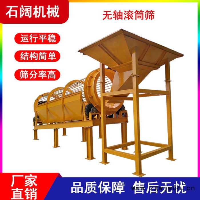 5、物料适应性广:无轴滚筒筛分机广泛应用于各类物料筛分,无论是砂、石块,还是泥土以及其它类物料,都是顺利进行筛分。