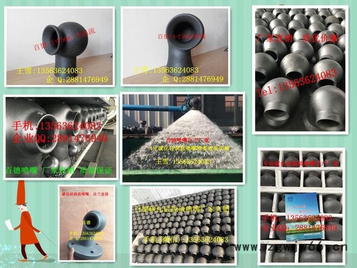 连接方式有卡箍连接,法兰连接,螺纹连接和缠绕连接等碳化硅大流量喷嘴又称为真空反应烧结碳化硅脱硫喷嘴,是火力发电厂、大型锅炉,脱硫除尘成套装置的关键部件。国内生产的反应烧结碳化硅脱硫除尘喷嘴,逐渐代替进口产品,同时具有高强度、高硬度、抗强烈腐蚀、剧烈磨损、耐高温等优良的性能,在恶劣的条件下有超长的使用寿命