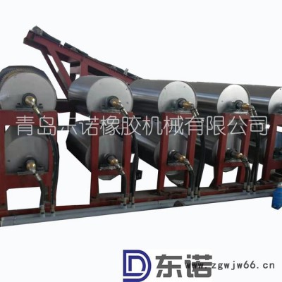 公司生产的胶片冷却线主要性能:对橡胶厂混炼后经压片机或双螺杆挤出机形成的胶片,浸隔离剂液后进入冷却风箱,强制风冷却,以达到可以叠放的温度.该设备联动性强.自动化程度高.操作简单. 结构形式:落地式(长8.5-15米),架空式(长12-42米).控制形式:PLC联动式. 输送形式有:挂胶杆输送和网带输送、滚筒输送;可根据用户的实际生产场地设计制造。