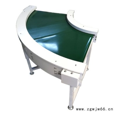 转弯传送带以扇形皮带加装专用的防跑偏滚轮(轴承外加聚甲醛POM)或者在传送带的外侧高频焊接导向筋使传送带运行在专用的导轨中,辊筒采用专用的锥型包胶辊筒,转弯传送带可输送的物料种类繁多,既可输送各种散料,也可输送各种纸箱、包装袋等单件重量不大的件货,用途广泛。