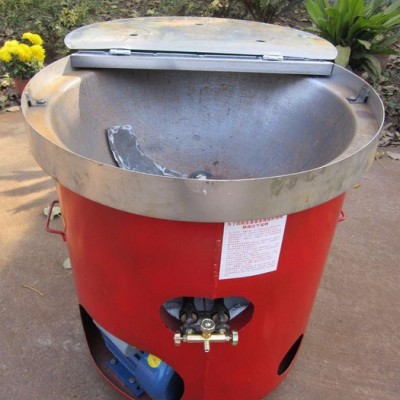 滚筒炒锅主要由机架、料斗、圆筒、挡火罩等组成,电机通过三角带带动齿轮轴,齿轮轴上的齿轮带动圆筒上的大齿轮转动;于是圆筒连续均匀地转动,物料从料斗喂入圆筒内进行蒸炒。能充分破坏油籽细胞。加水蒸炒时, 使蛋白质吸水膨胀,可以从细胞内部彻底的将尚未破裂的细胞“攻破”,使分散的细油滴能够进一步凝聚。从而提高出油率。使蛋白质充分凝固变性而变硬,提高承受压力的能力,也有利于油脂凝聚。实践证明,蛋白质变性越彻底,压榨出油率**越高。湿热作用使:磷脂吸水膨胀、蛋白质变性后在油中的溶解度降低,油脂变清(加热时不起锅);有水蒸气保护,油料不糊,加工出来的油液色泽较浅,不发黑。