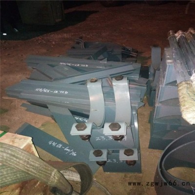 由管夹×2、支座×1,PTFE(聚四氟乙烯)板×1,滑动底板×1,以及螺栓螺母组合而成,主要工艺为弯制和焊接。管夹导向支座的主体和管夹滑动支座比较相似,管夹部分多了8块加强筋,支座部分相同,导向底板两侧焊有导向立板和加强筋,另外,聚四氟乙烯板的尺寸与管夹滑动支座不同。使用时需注意:当支座放于支墩或钢结构支架上,支座的滑动底板与根部之间如需用垫铁调整高度时,应将滑动底板垫紧找平,垫铁与根部及垫铁与滑动底板之间均应焊牢。在焊接时,应将滑动板(聚四氟乙烯板)暂时取掉,待焊完后才垫入。