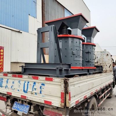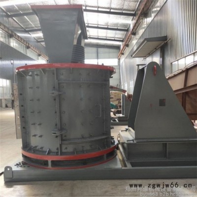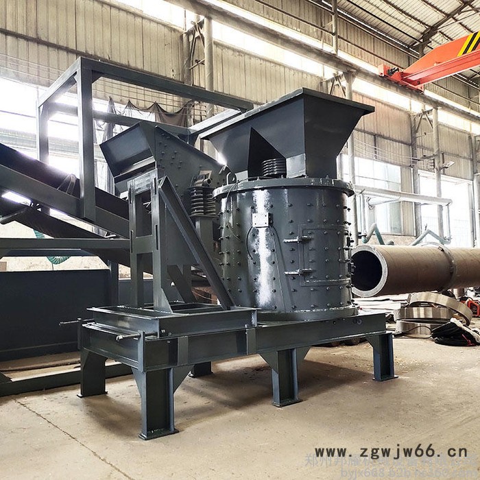 物料由机器上部垂直落入高速旋转的叶轮内,在高速离心力的作用下,与另一部分以伞状形式分流在叶轮四周的物料产生高速撞击与粉碎,物料在互相撞击后,又会在叶轮和机壳之间以物料形成涡流多次的互相撞击、摩擦而粉碎,从下部直通排出,形成闭路多次循环,由筛分设备控制达到所要求的成品粒度。