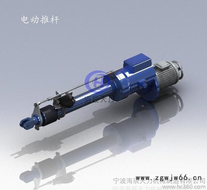 本产品以电动机为动力,用减速箱把原转速降为所需转速,通过丝杆、螺母付把旋转运动变成直线运动,用电动机的倒、顺转来改变推杆的推与拉。